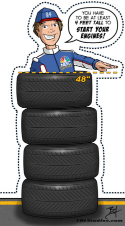 The illustrations I did went over so well that they hired me to do a third illustration of a “You must be this tall” sign for outside the bumper car ride. I came up with a young boy popping out of a stack of NASCAR tires with his hand at the 48″ inch mark indicating how tall you had to be to enter the ride. This was a great project to work on and a real blast to see my work on national TV.